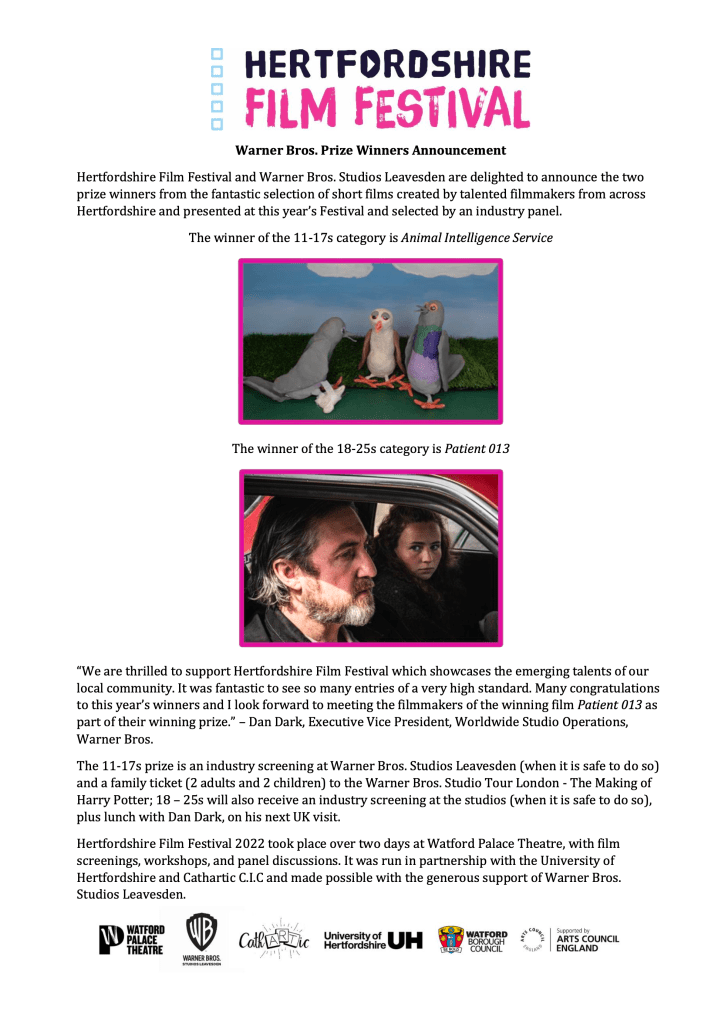 William is a former winner of the Chorleywood Film Club Young Filmmaker competition. He won in the 11-17’s category with his film Animal Intelligence Service, selected by a panel from Warner Brothers Studio Leavesden. “The standards were so incredibly high, it was a very close competition!” commented the Hertfordshire Film Festival Team.